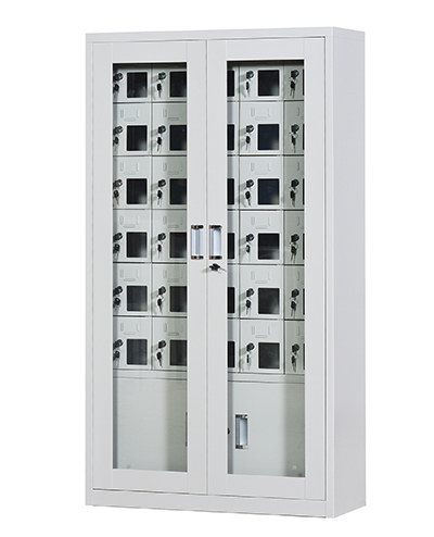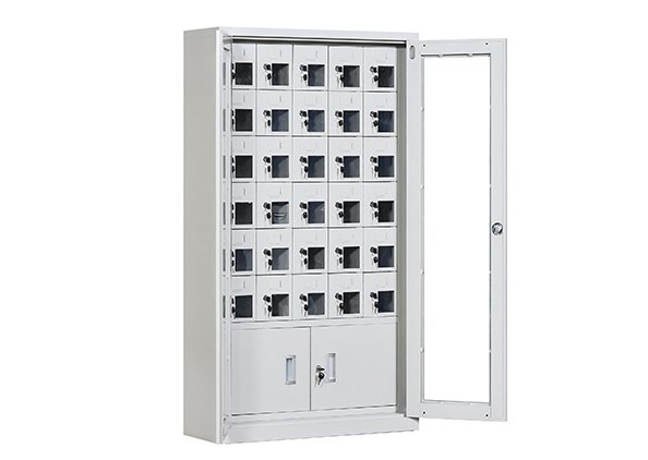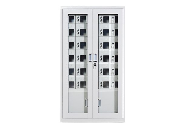 手機保密柜正面為對開金屬邊框玻璃大門,便于觀察柜內情況,堅固透亮,美觀大方。